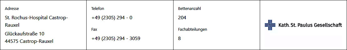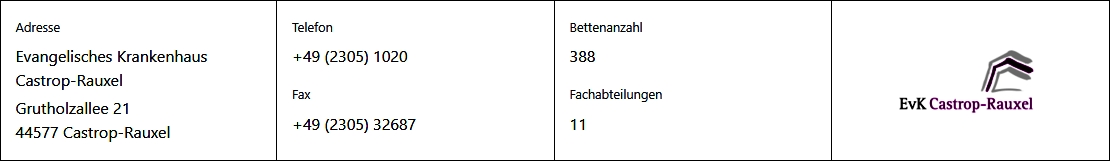Angeschlossen sind die Augen- und Laser-Klink Castrop-Rauxel (ambulanter OP, Tagesklinik), die operative Belegabteilung am St. Rochus-Hospital sowie die Privatpraxis im Stadtteil Henrichenburg.